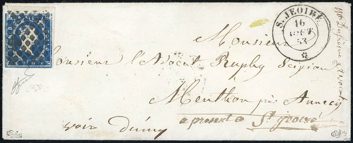 S. JEORIE, punti 12 - 20 cent. (2), bordo di foglio in alto, non tosato, leggermente sfiorato in basso, su piccola bustina del 16/8/1853 per Annecy, rispedita a S. Jeorie. Rara! Ferrario.