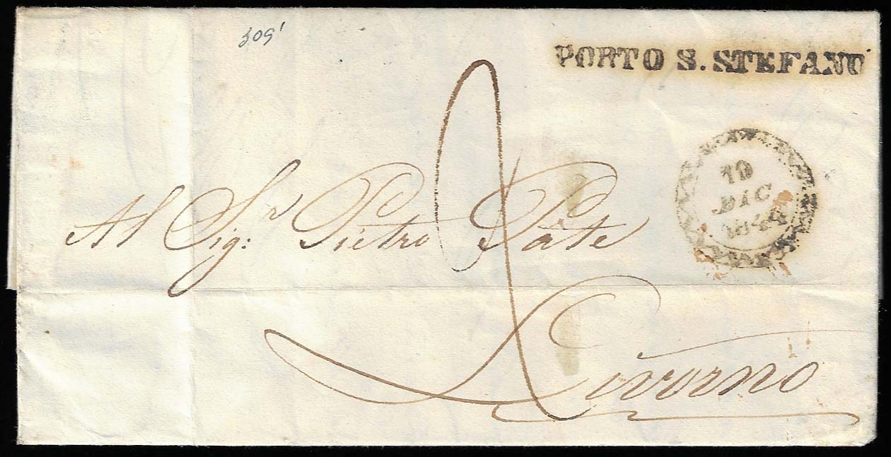 1844 - Lettera prefilatelica dall'Isola del Giglio 17/10/1844, lineare e datario di Porto S.Stefano, a Livorno, tassata 2 crazie. Rara!