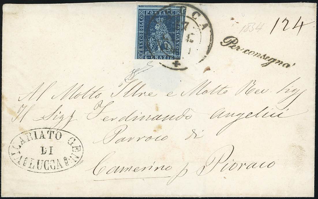 1854 - 6 crazie azzurro scuro su azzurro (7c), due margini eccezionali, corto in basso, su sovracoperta di lettera raccomandata da Lucca 17/1/1854, lineare "per consegna" a Camerino nello Stato Pontificio. Ferrario.
