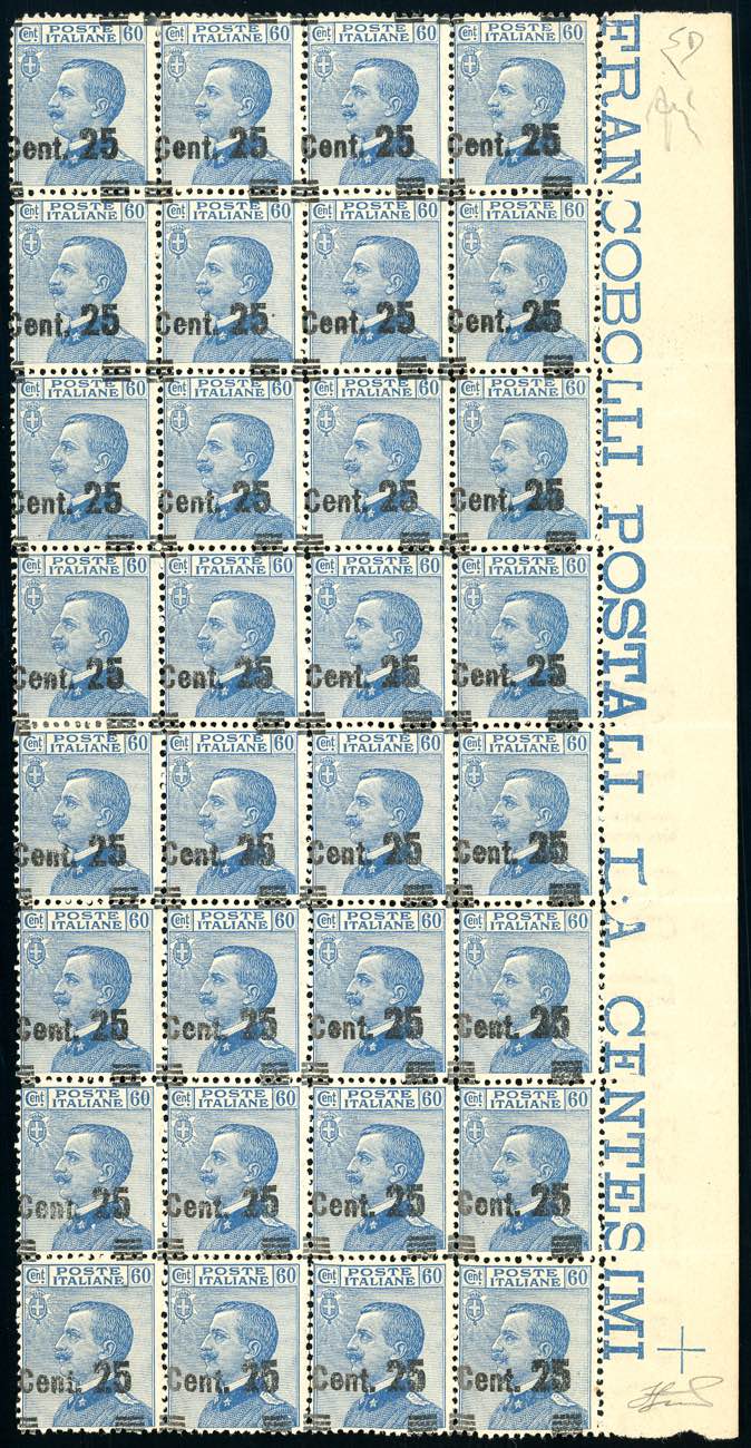 1924 - 25 cent. su 60 cent., I tipo, soprastampa fortemente spostata in alto e a sinistra (178gba), blocco di 32 esemplari, bordo di foglio, gomma integra, perfetto. E.Diena, Ferrario.