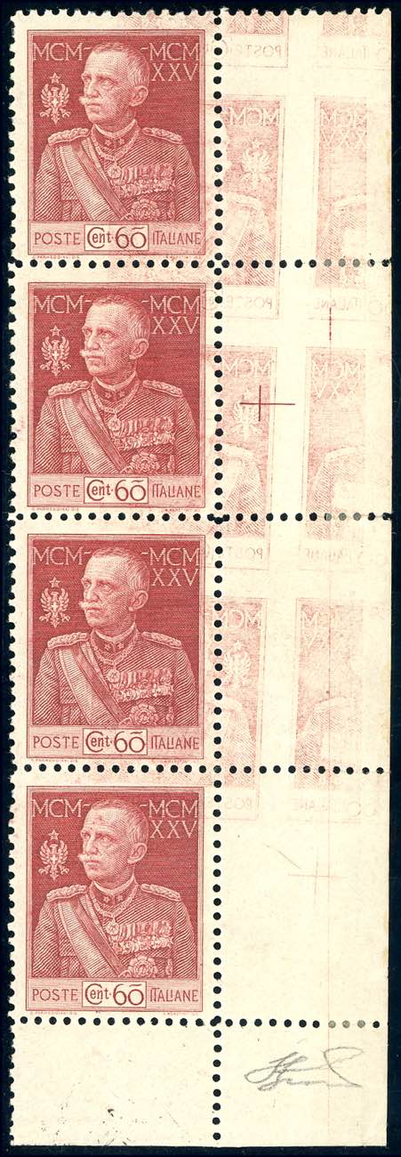 1925 - 60 cent. Giubileo, dent. 11, striscia verticale di quattro, decalco al recto, parziale o completo (189q), angolo di foglio, gomma ... Leggi tutto