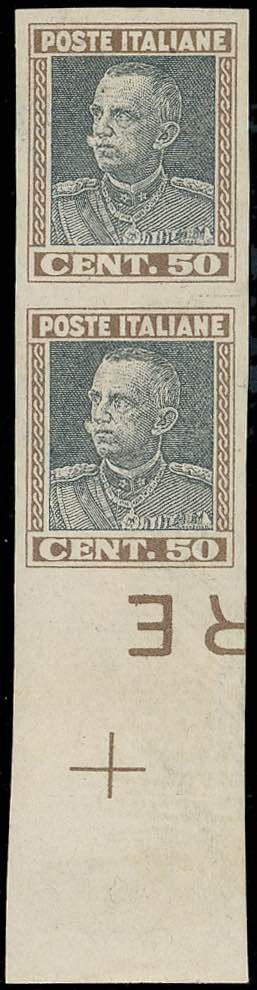 1927 - 50 cent. Parmeggiani, non dentellato (218h), coppia verticale, bordo di foglio, gomma integra, perfetta. Bella. Cert. Raybaudi.