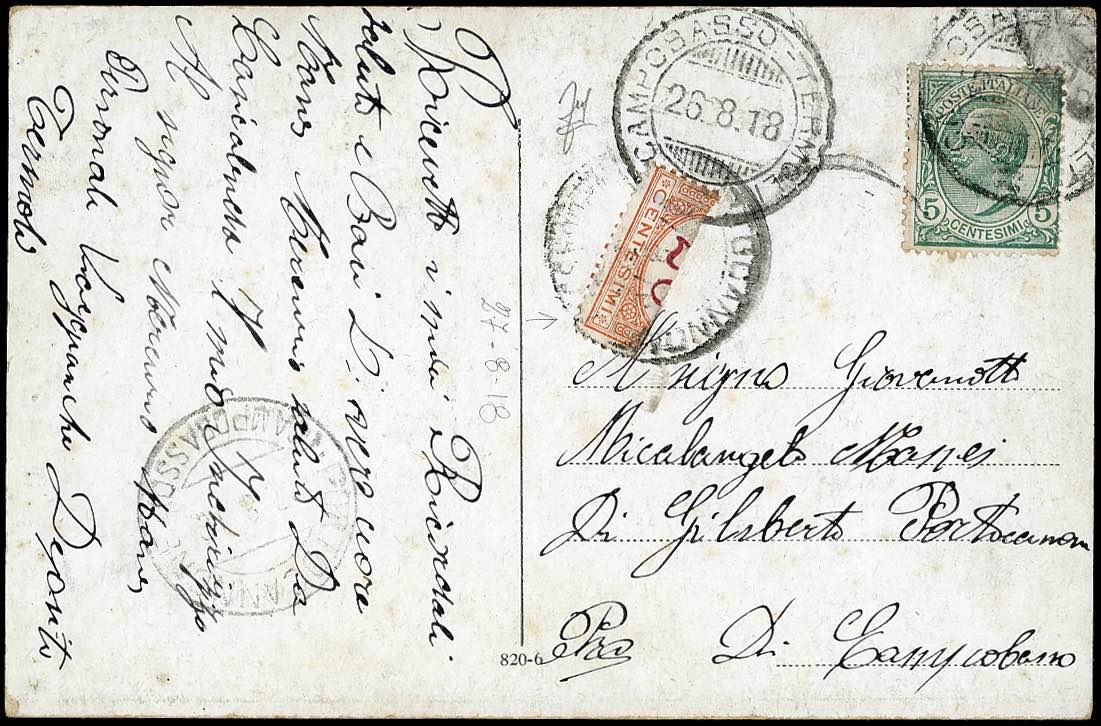 1918 - 20 cent. arancio e carminio (22), frazionato a metà orizzontalmente, su cartolina affrancata insufficientemente con 5 cent. Leoni (81) da Campobasso 26/8/1918 per Portocannone. Rara!