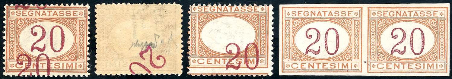 1890 - 20 cent. arancio e carminio, cinque esemplari con varietà (22g,22b,22db, una non catalogata), gomma originale/integra, ottimo stato. Un esemplare cert. Caffaz.