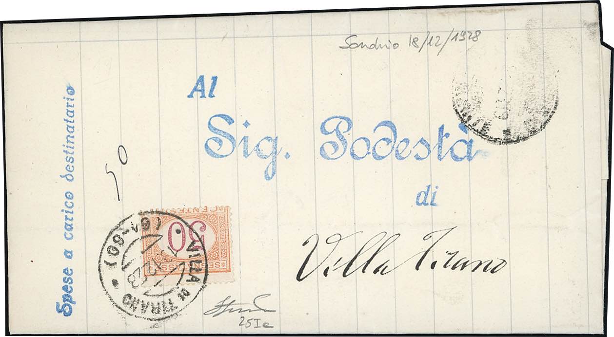 1928 - 50 cent. arancio e carminio, dentellatura ortizzontale fortemente spostata in basso, dicitura "CENTESIMI" quasi assente (25la), perfetto, su sovracoperta di lettera con tassa a carico del destinatario da Sondrio 18/12/1928 a Villa di Tirano. Ferrario.