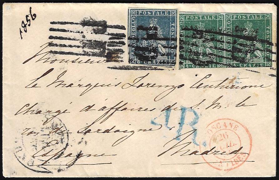 1856 - 4 crazie verde grigio, coppia, 6 crazie ardesia su grigio (6,7), alcuni margini intaccati, su busta da Livorno 23/7/1856 a Madrid, ... Leggi tutto