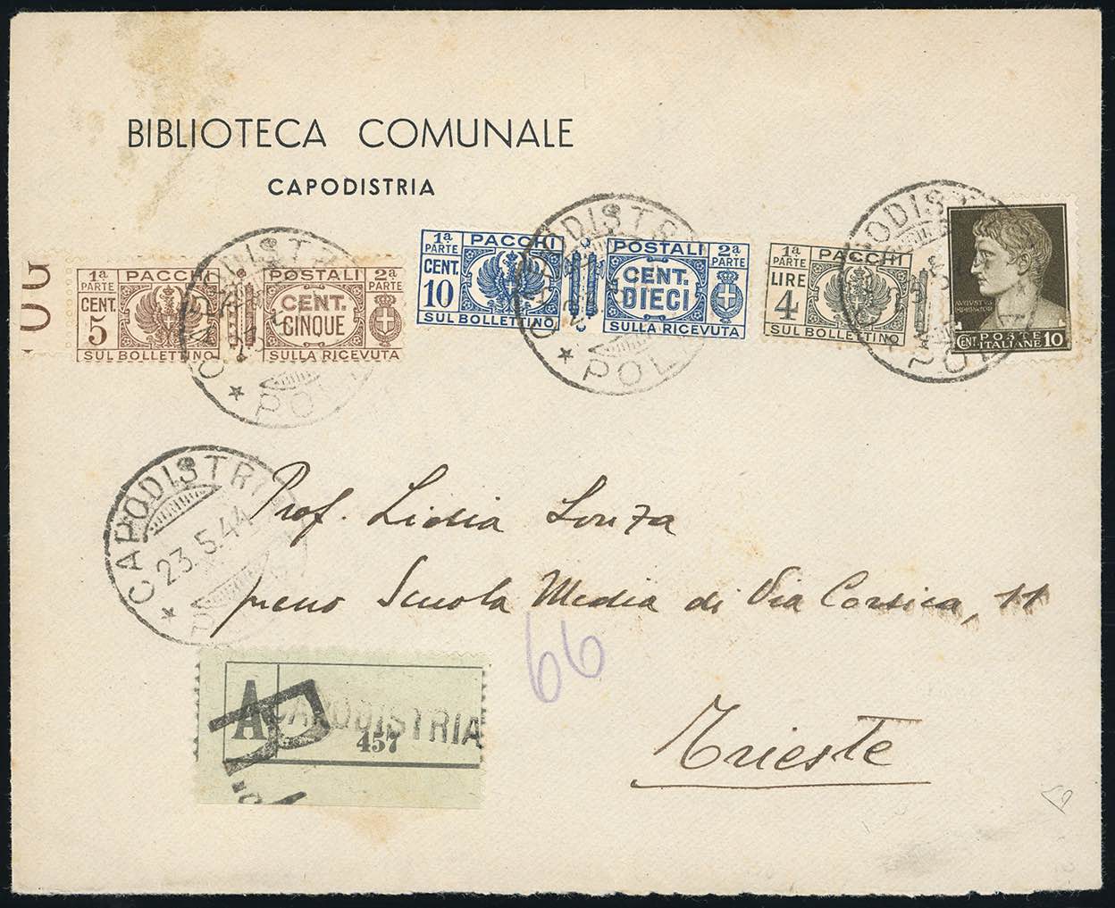 1944 - 4 lire, la sola sezione di sinistra, 5 cent., 10 cent. pacchi postali con fasci al centro, 10 cent. Imperiale (33,24,25,245), perfetti, su busta raccomandata da Capodistria 23/5/1944 a Trieste. Rara affrancatura mista d'emergenza, comprendente una frode postale e due valori gemelli. Cert. E.Diena.