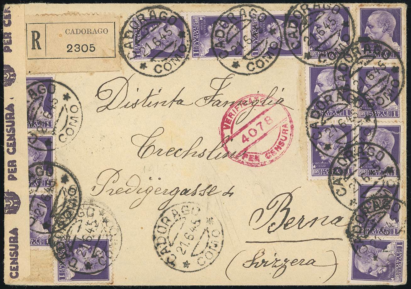 1945 - 1 lira emissione di Novara (540), quindici esemplari, alcuni difetti, su busta raccomandata da Cadorago 21/6/1945 a Berna, Svizzera, verificata per censura. Pregevole affrancatura monovalore.