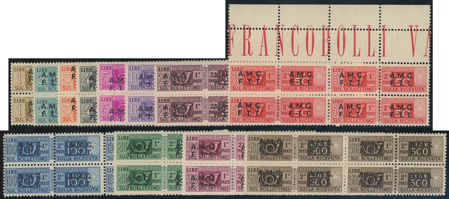 PACCHI POSTALI 1947/48 - Soprastampati su due righe (1/12), blocchi di quattro, gomma integra, perfetti. Avi per i tre alti valori, che hanno ottima centratura. Alti valori cert. Ferrario.