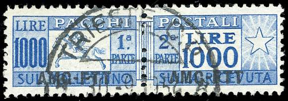 PACCHI POSTALI 1854 - 1.000 lire Cavallino, filigrana ruota, dent. 13 1/4 lineare (26/I), usato, perfetto. Raro. Ferrario.