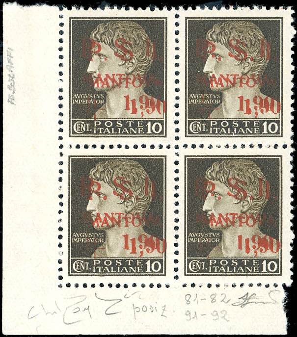 MANTOVA 1945 - 1,90 lire su 10 cent., doppia soprastampa (1b), blocco di quattro, angolo di foglio, gomma integra, perfetto. Raro, tiratura ... Leggi tutto