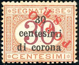 TRENTINO ALTO ADIGE - BOLZANO 3 1919 - 30 cent. di corona, segnatasse, soprastampa "Porto S.T." capovolta in rosso (Sassone 2021 pag. 630 riquadro, non citata capovolta), gomma originale, perfetto, lievi ossidazioni. Venne predisposto dal titolare dell'ufficio postale pochi giorni prima del 20/4/1919, data in cui venne reso obbligatorio l'uso di francobolli e dei segnatasse italiani. Rarissimo, probabilmente unico! Cert. Ferrario.