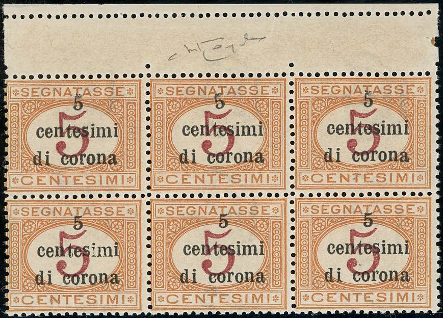 TRENTO E TRIESTE SEGNATASSE 1919 - 5 cent. su 5 cent., cifra "5" inclinata a sinistra, blocco di sei (1ga), bordo di foglio, gomma integra, perfetto. Raybaudi.