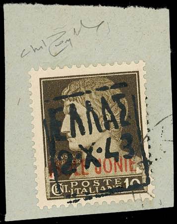 ZANTE AMMINISTRAZIONE CIVILE GRECA 1943 - 10 cent., soprastampa nera (1), perfetto, usato su frammento. Raybaudi.