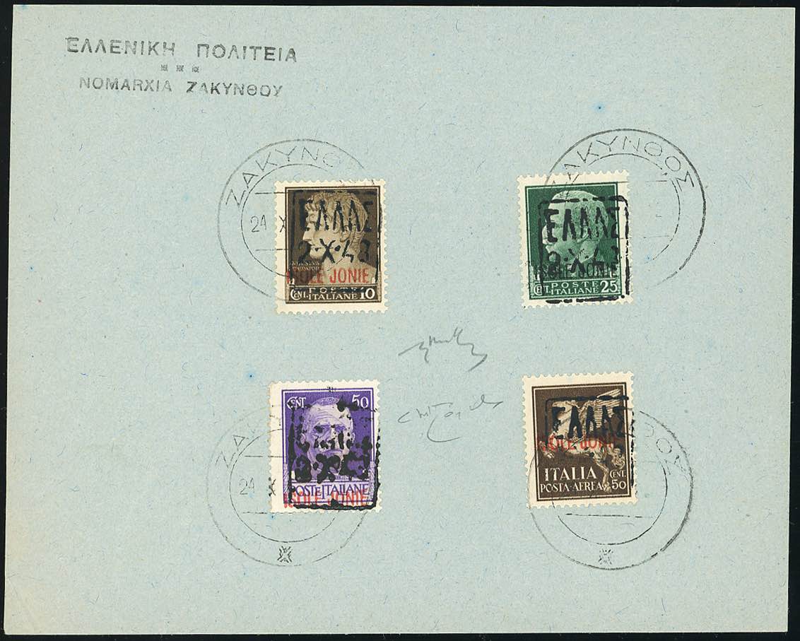 ZANTE AMMINISTRAZIONE CIVILE GRECA 1943 - Soprastampati in nero, quattro valori (1/3,A1), perfetti, usati su frammento. Raybaudi, ... Leggi tutto