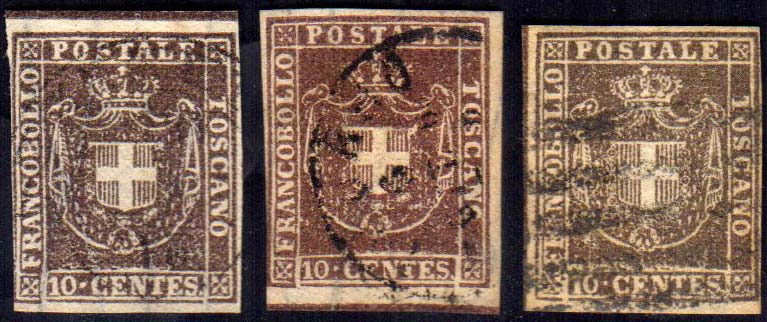 1860 - 10 cent., tre esemplari, tinte differenti, con linea di riquadro in alto, in basso e a sinistra (19g,19i,19k), usati.