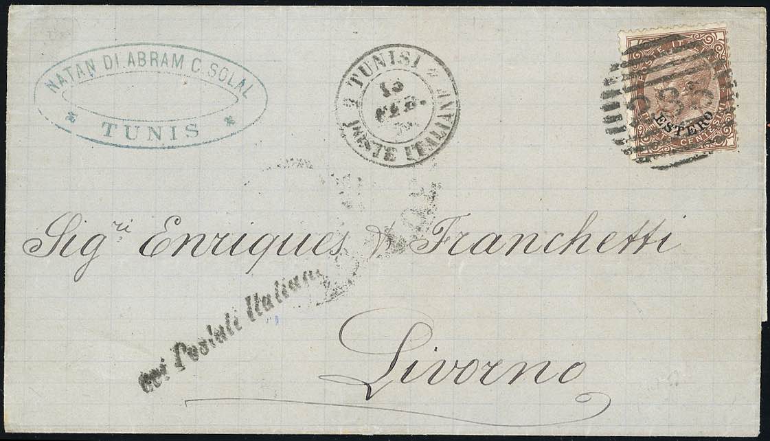 TUNISI 1878 - 30 cent. soprastampato (6), perfetto, su sovracoperta di lettera da Tunisi 137271878, lineare "Coi Postali Italiani" a Livorno. Bollo lineare non catalogato con i De La Rue soprastampati.