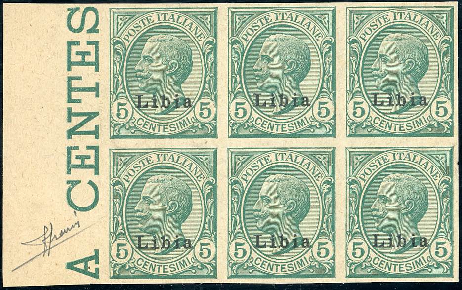 1921 - 5 cent. Leoni soprastampato (3), prova di macchina, blocco di sei, bordo di foglio, senza gomma come sempre, perfetta. Sorani.