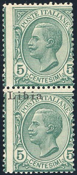 1912 - 5 cent. Leoni, coppia verticale, il primo esemplare senza soprastampa, il secondo con soprastampa fortemente spostata in alto e a sinistra (3gaa), gomma integra, perfetta. Ferrario.