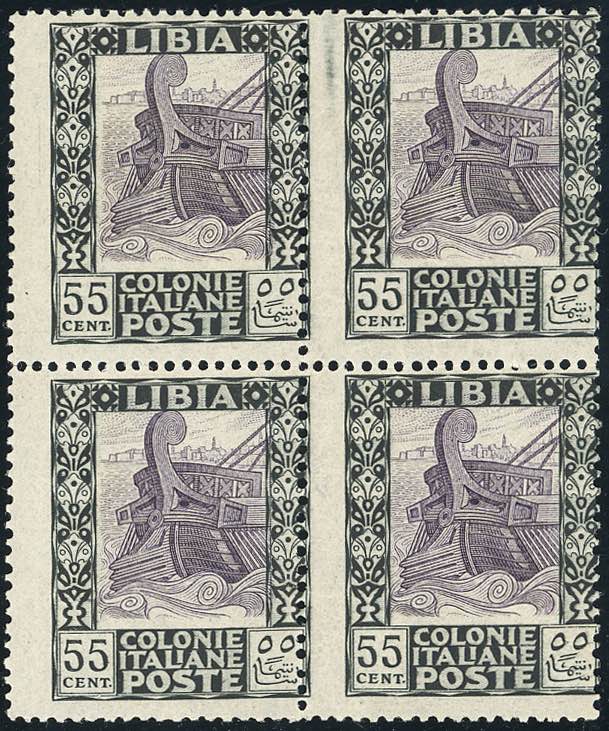 1925 - 55 cent. Pittorica, senza filigrana (52), blocco di quattro, dentellatura verticale fortemente spostata a sinistra, centro spostato in alto, gomma originale integra, perfetto. Insieme molto raro. Cert. Oro Raybaudi.