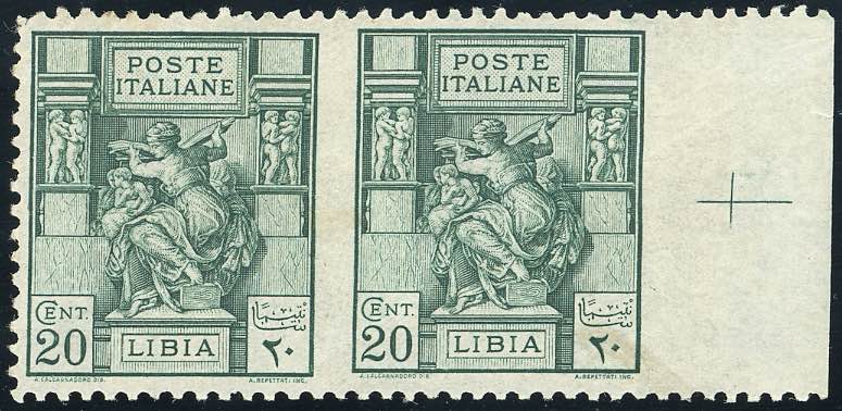 1926 - 20 cent. Sibilla Libica, dent. 11, coppia orizzontale non dentellata al centro e a destra (54g), bordo di foglio, gomma originale, leggerissima traccia di linguella, perfetta. Rara e molto fresca. Ferrario.