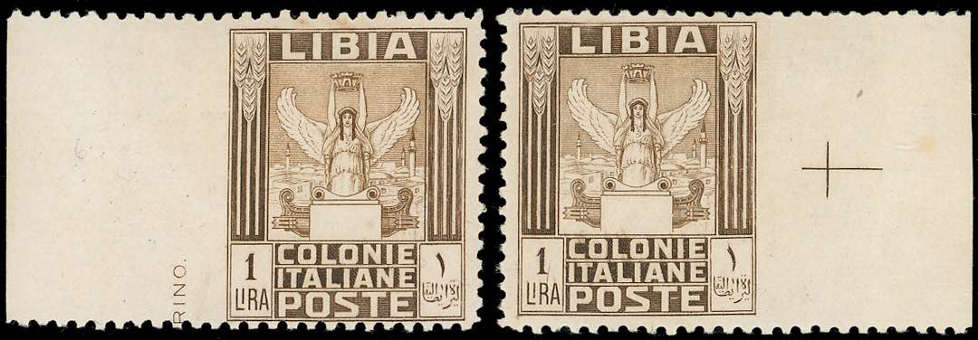 1926 - 1 lira Pittorica, dent. 11, un esemplare non dentellato a sinistra, uno non dentellato a destra (65f,65g), entrambi bordo di foglio, gomma integra, perfetti. Belli! Ferrario.