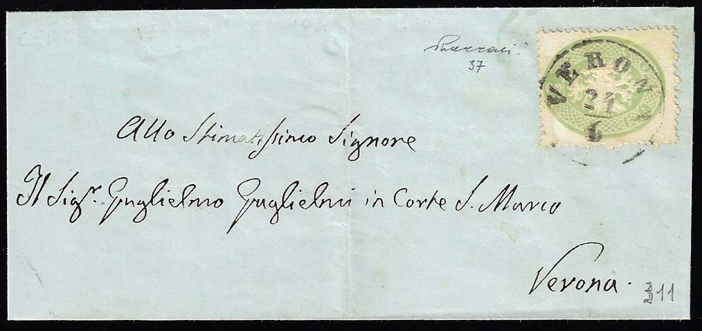 1863 - 3 soldi verde giallastro, dent. 14 (37a), perfetto, isolato su sovracoperta di lettera da Verona 24/6 per città. Cert. Vaccari.