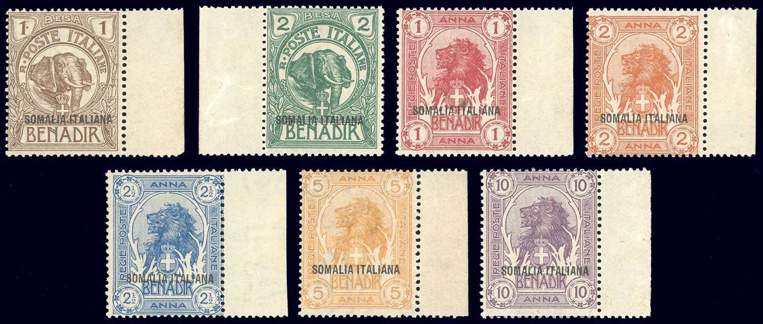 1921 - Elefanti e Leoni, non emessi (23A/23G), bordo di foglio, gomma integra, perfetti. Splendidi e rari, in eccellente stato di conservazione. Tiratura 50 serie. G.Bolaffi, A.Diena, A.Zanaria, cert. E.Diena e Ferrario.