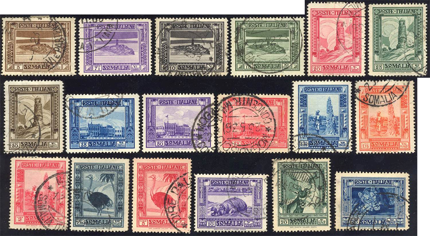1935/38 - Pittorica, dent. 14, serie completa (213/230), usati, perfetti. A. e R.Diena per il 20 lire.