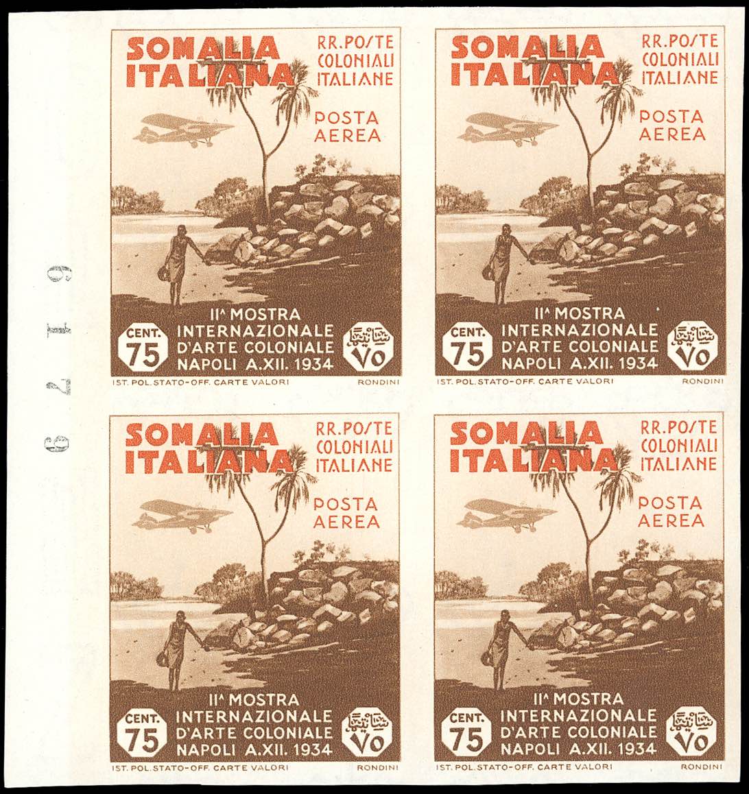 POSTA AEREA 1934 - 75 cent. Arte Coloniale, non dentellato (3a), eccezionale blocco di quattro, bordo di foglio, gomma originale, integra ... Leggi tutto