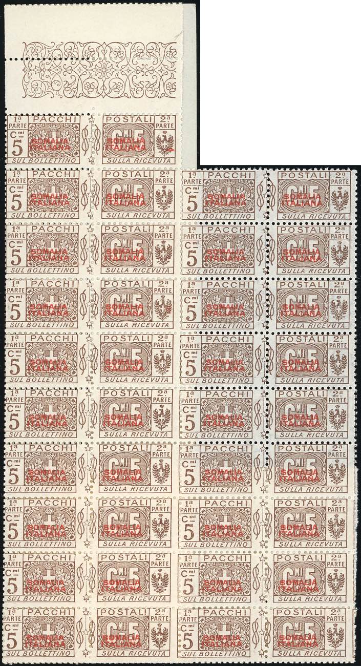 PACCHI POSTALI 1926 - 5 cent. soprastampa rossa del I tipo (43), non emesso, blocco di 19 esemplari, gomma integra, perfetto. Molto freschi.