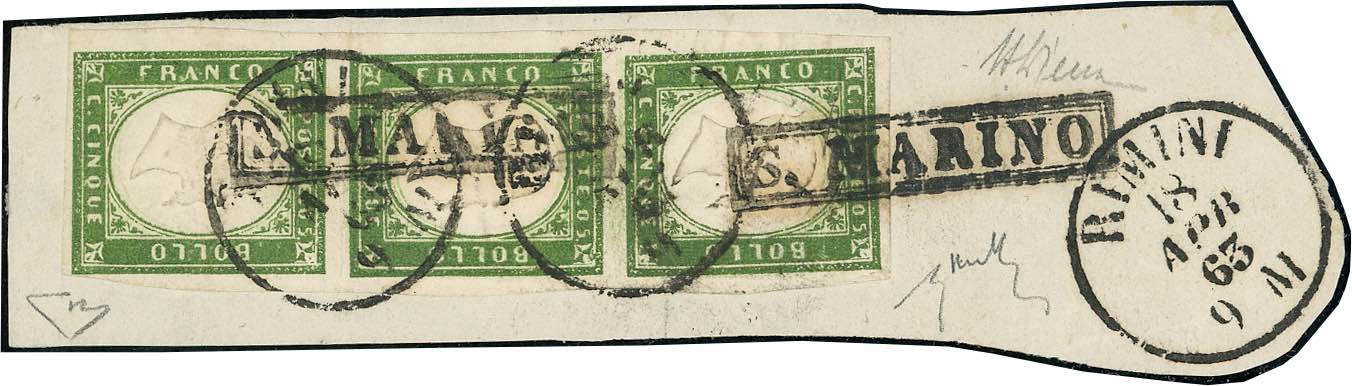 1863 - 5 cent. verde (Sardegna 13E,RSM A1), striscia vertcale di tre, perfetta, su frammento, annullata con il bollo in cartella S.Marino e il datario di Rimini 18/4/1863. Una delle due sole strisce note di questo francobollo usate a S.Marino. A.Diena, Chiavarello, Ferrario, cert. E.Diena.