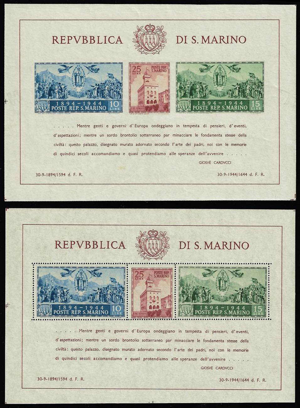 1945 - Palazzo del Governo, due foglietti dentellato e non (6/7), nuovi, gomma originale integra, perfetti. Ferrario.