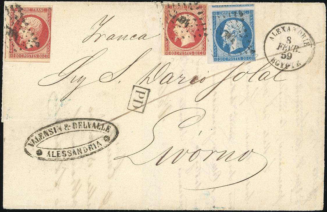 FRANCIA 1859 - 20 cent., 80 cent., due esemplari Napoleone III (14,17), difetti di marginatura, su lettera dall'ufficio postale francese di Alessandria d'Egitto 8/2/1859 a Livorno.