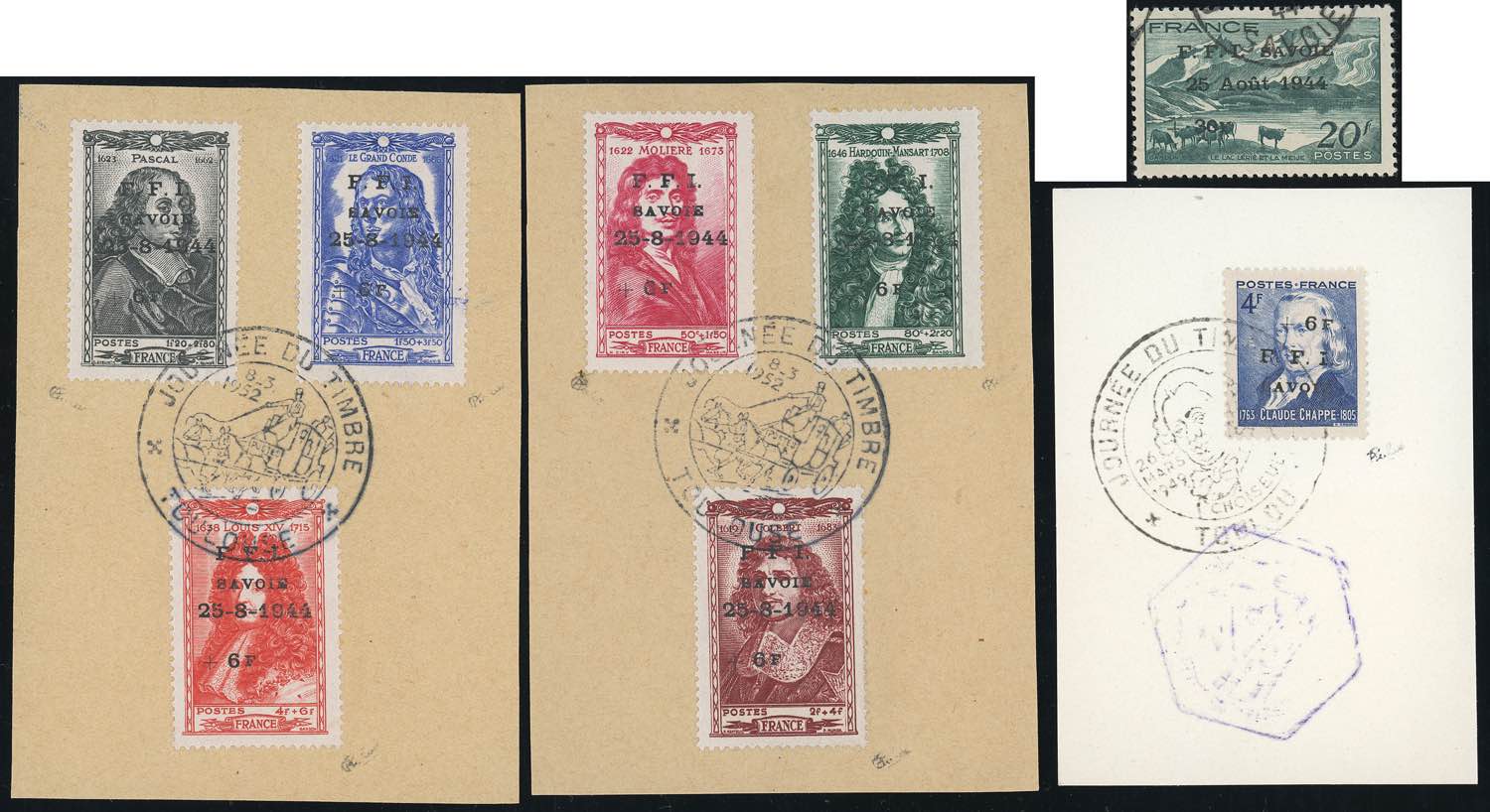 FRANCIA LIBERAZIONE 1944 - Celebrità (Unif.612/617), 4 fr. Chappe (819), 20 fr. Lago Lèriè (582), soprastampati "SAVOIE…", usati, perfetti. Raro insieme. Firmati Calves e cert. Varga.