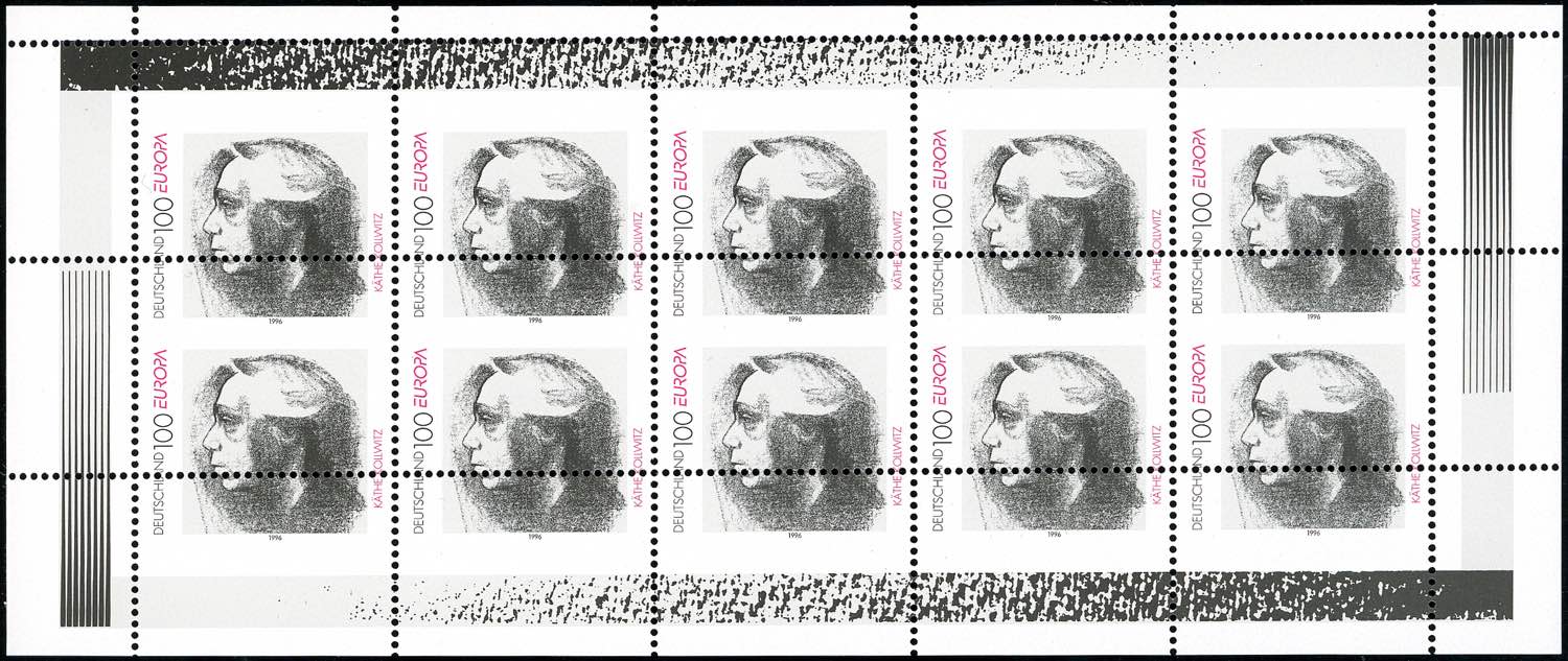 GERMANIA 1996 - 100 p. Europa CEPT (1687), minifoglio di 10 esemplari con dentellatura orizzontale fortemente spostata in alto, gomma integra, perfetto. R.Diena.