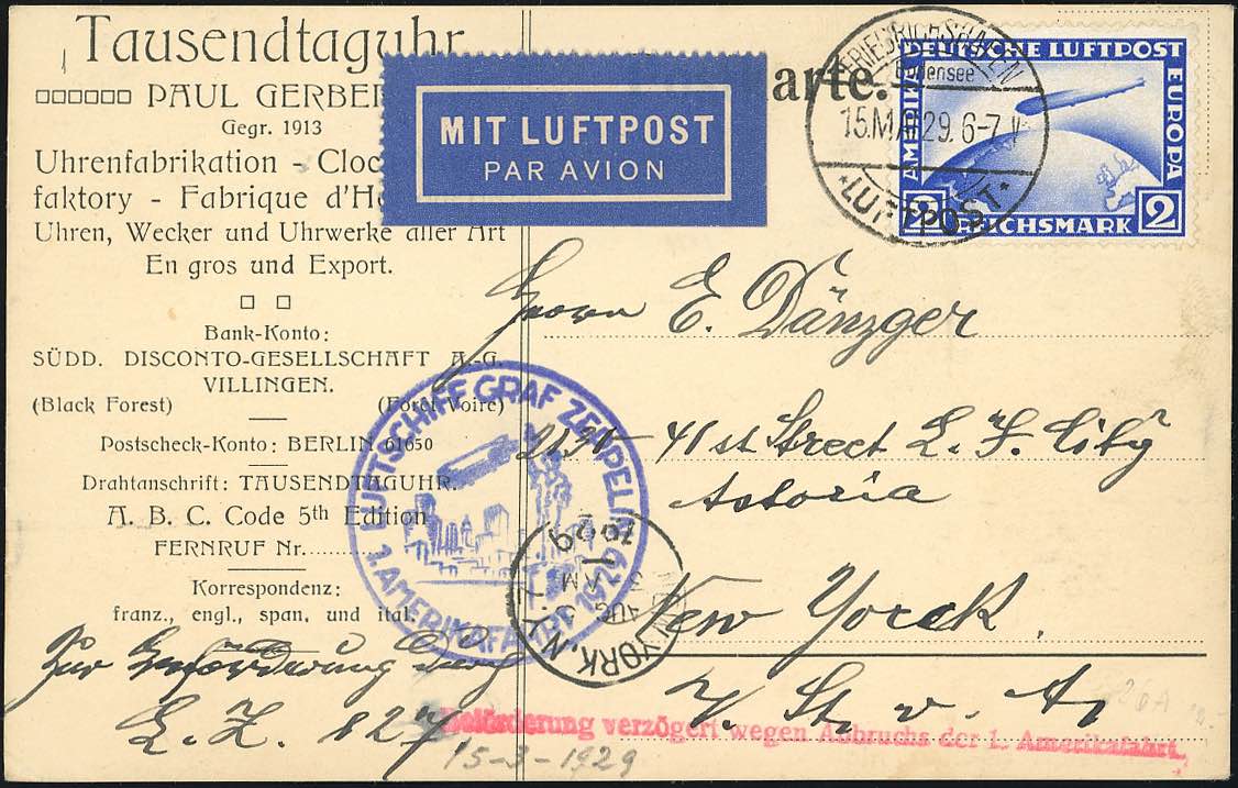 GERMANIA REICH POSTA AEREA ZEPPELIN 1929 - Cartolina 1°Sudamerikafahrt per New York, bolli speciali, francobollo perfetto.