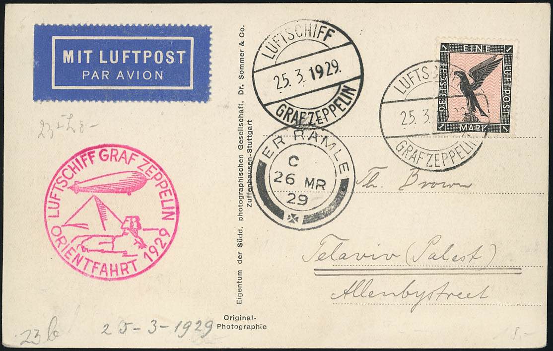GERMANIA REICH POSTA AEREA ZEPPELIN 1929 - Cartolina Orientfahrt 1929 del 25/3/1929 per Tel Aviv in Palestina, bolli speciali, francobollo perfetto.