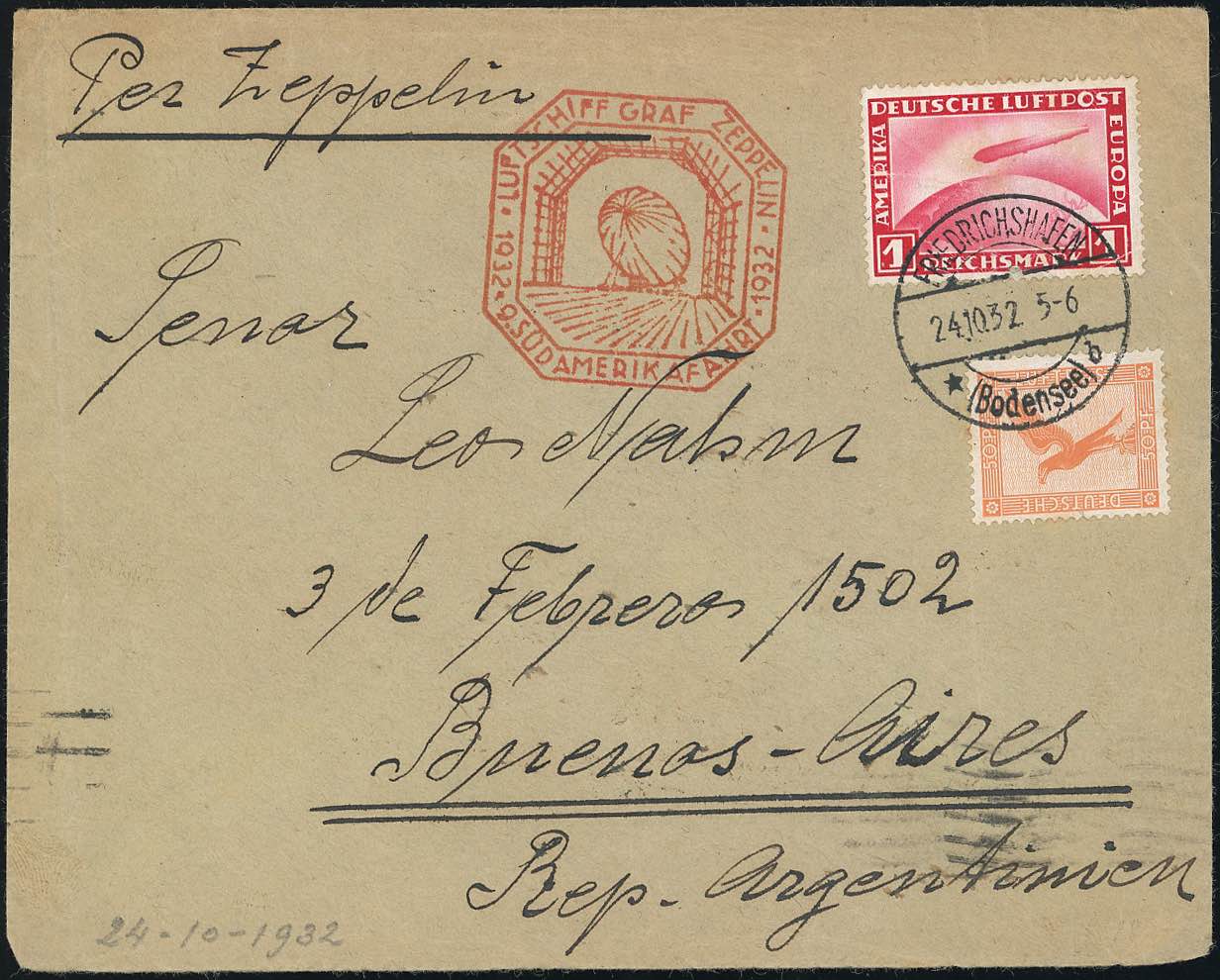 GERMANIA REICH POSTA AEREA ZEPPELIN 1932 - Aerogramma da Friedrichshafen 24/10/1932 a Buenos Aires, via Zeppelin 9°Sudamerikafahrt, francobolli perfetti.
