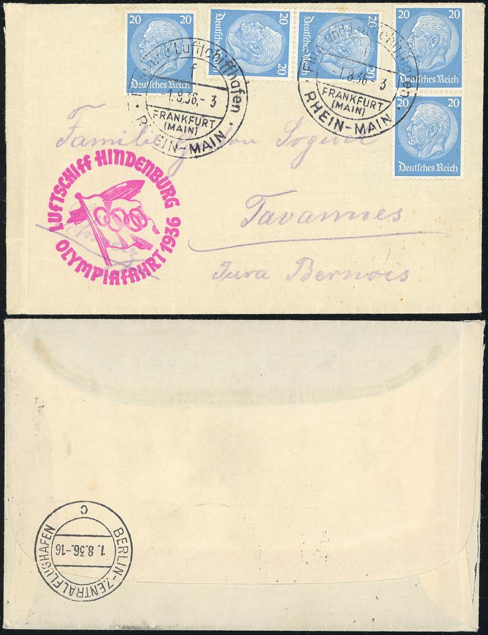 GERMANIA REICH POSTA AEREA ZEPPELIN 1936 - Aerogramma Olympiafahrt 1936, da Rhein Main a Tavannes, francobolli perfetti.