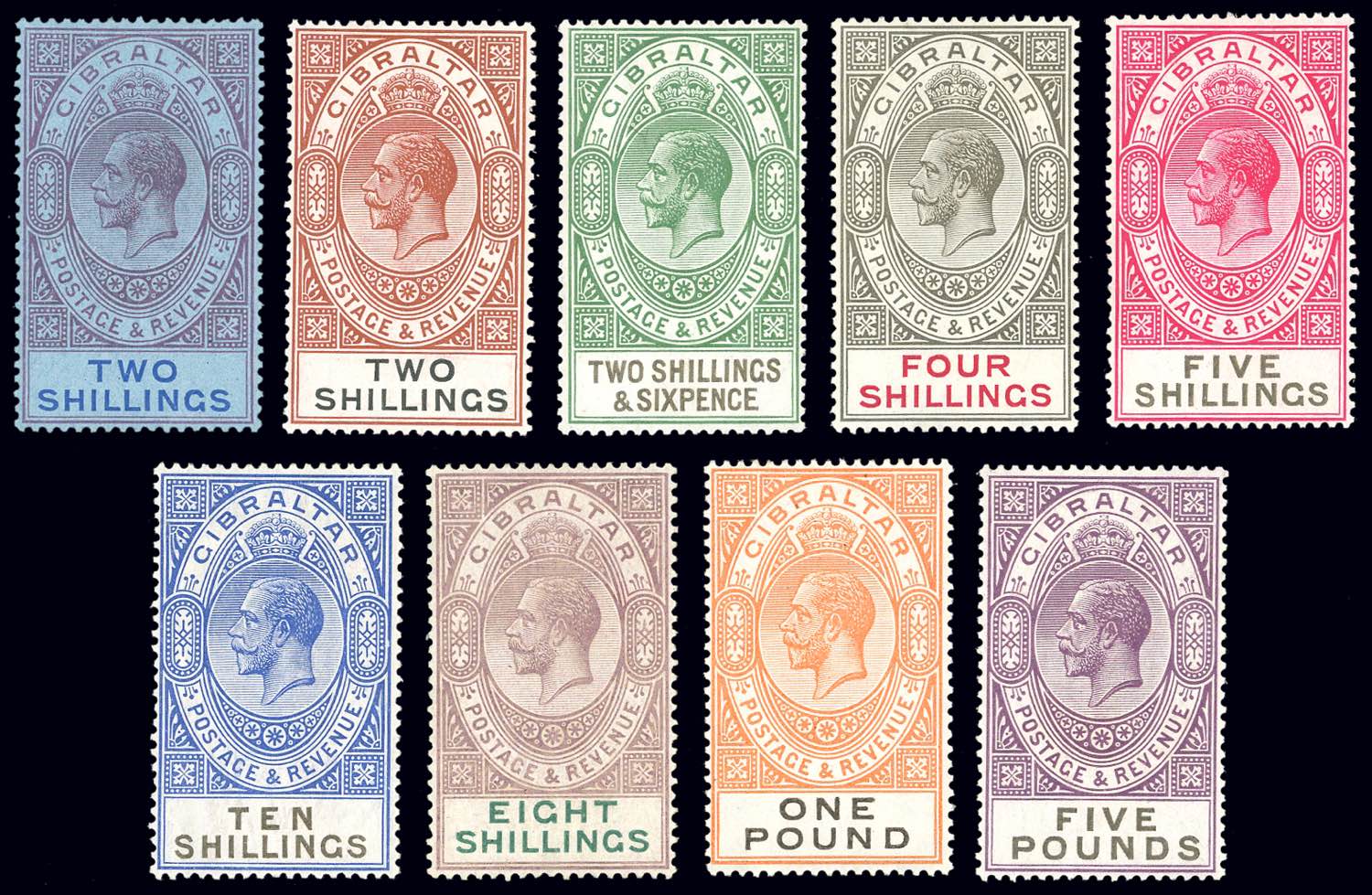 GIBILTERRA 1921/32 - Giorgio V, filigrana CA corsivo multipla F3, serie dei 9 valori (Unif.82/90), nuovi, gomma originale, leggera traccia di linguella, perfetti. Molto freschi, ottima qualità. Il 5 sterline cert. Balasse.