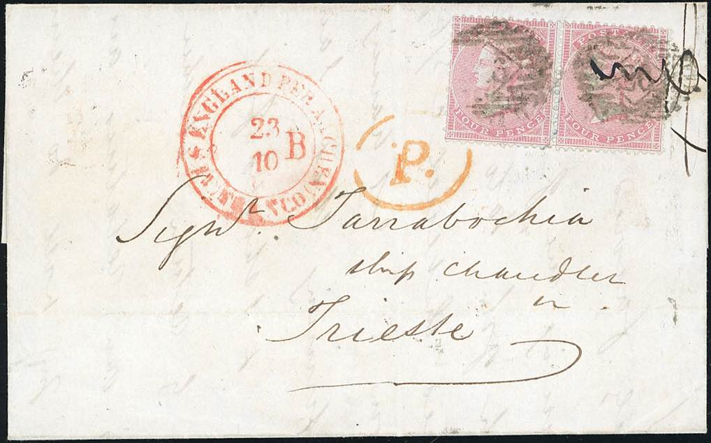 GRAN BRETAGNA 1855 - 4 p. Regina Vittoria (16), coppia, perfetta, su lettera da Londra 22/10/1855 a Trieste.
