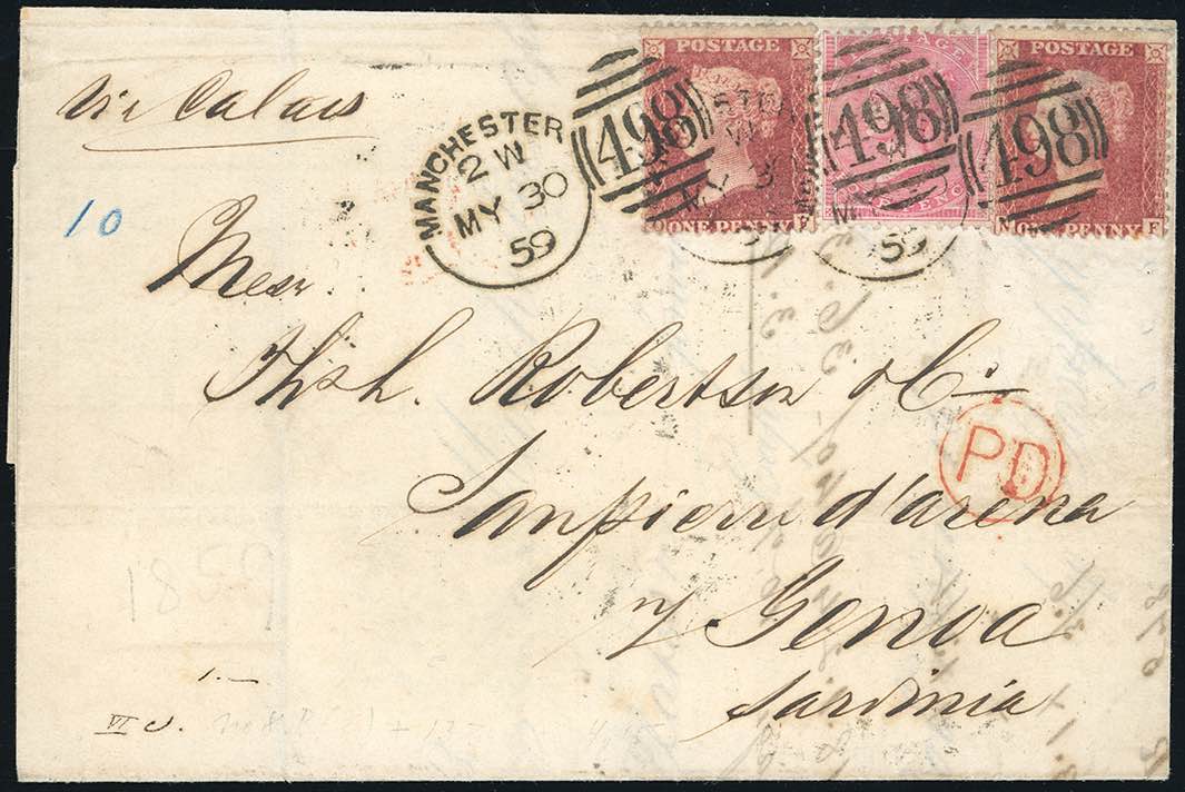 GRAN BRETAGNA 1859 - 1 p., due esemplari, 4 p. Regina Vittoria (18,26), perfetti su lettera scritta a Manchester il 30/4/1859 ma spedita il 30/5/1859 per Genova. Interessante documento, il cui ritardo nella spedizione è probabilmente da imputarsi alla guerra in corso tra il Regno di Sardegna e l'Austria.