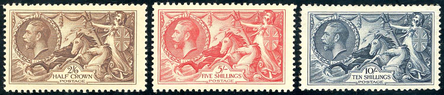 GRAN BRETAGNA 1934 - Cavalli Marini, fondo a linee incrociate (Unif.198/200), nuovi, gomma originale integra, MNH, perfetti. Oliva.