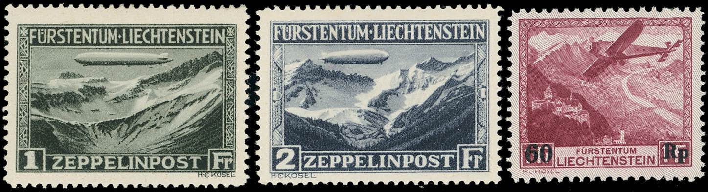 LIECHTENSTEIN POSTA AEREA 1931/35 - Zeppelin e 60 r. su 1 f. Soprastampato (A7/8,A14), gomma integra, perfetti.