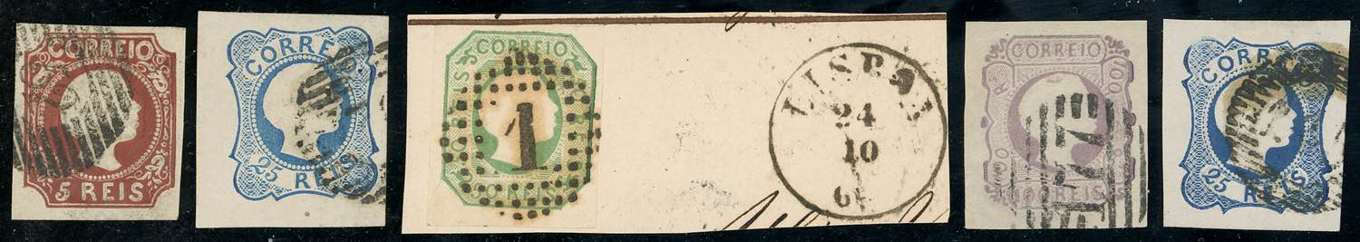 PORTOGALLO 1855 - Re Pietro V, cinque valori (5/8,6a), usati, perfetti.