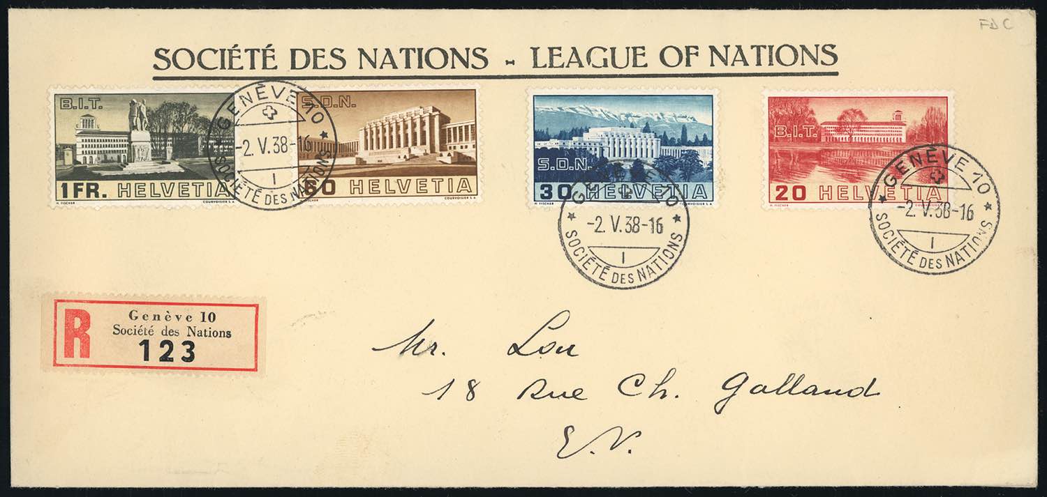 SVIZZERA 1938 - Società delle Nazioni (307/310), perfetti, usati su busta FDC raccomandata da Ginevra 2/5/1938, annullo speciale primo giorno d'emissione, per città. Bella.