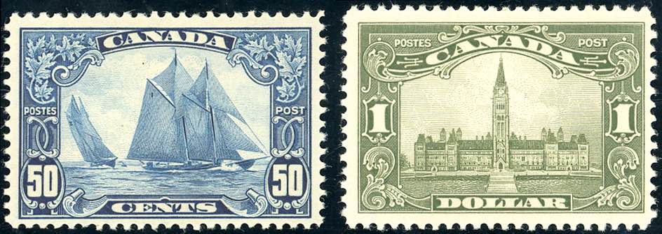 CANADA 1928/29 - 50 cents Bluenose e 1 d.Parlamento di Ottawa (Yv138/139), neri, gomma originale, MLH, perfetti. Molto freschi.