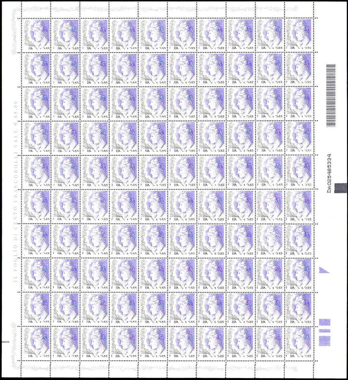 REPUBBLICA ITALIANA 2003 - 0,85 € Donna nell'arte (2729), foglio completo di 100 esemplari, tutti con stampa del nero evanescente o ... Leggi tutto
