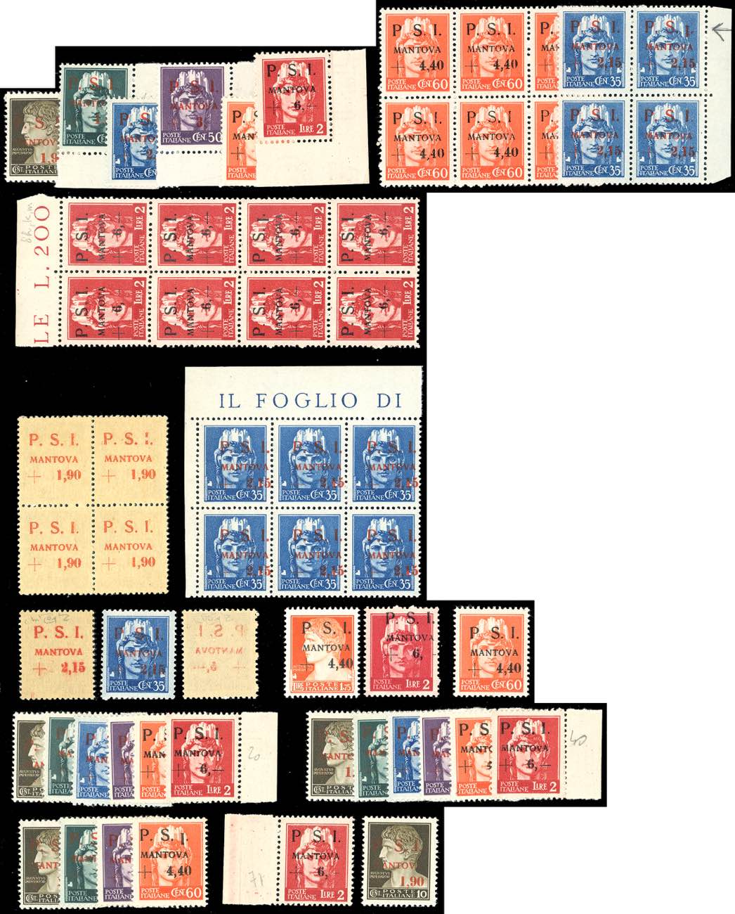 C.L.N. MANTOVA 1945 - Splendida ed avanzata collezione di 58 esemplari dell'emissione, anche in coppie o blocchi, con interessanti varietà. Ottima qualità generale, cinque certificati. Occasione!